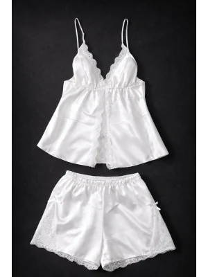Beyaz Bağlama Detay Yırtmaçlı Tül Şık Kadın Gecelik Ve Külot