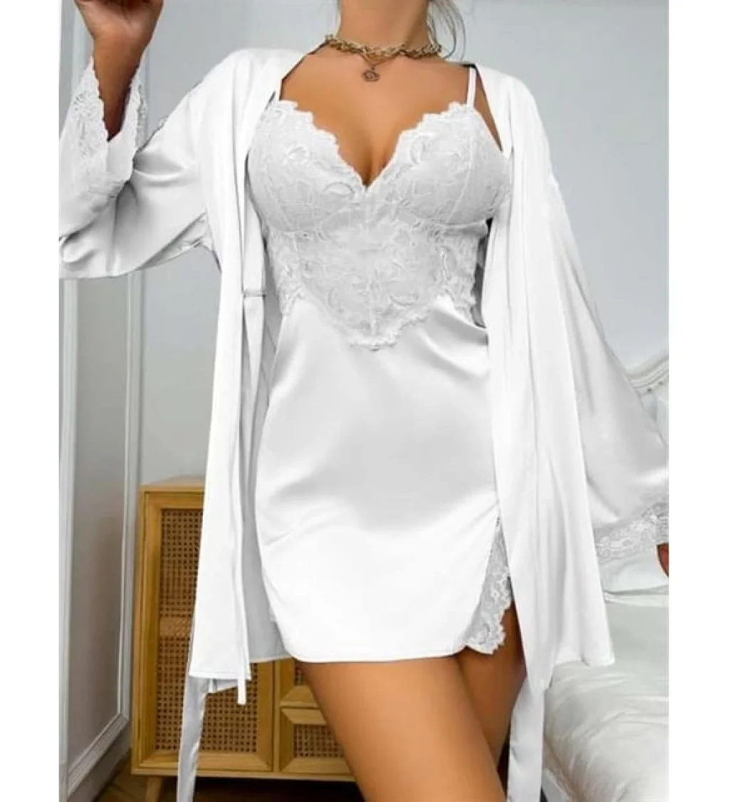 ✨ Tasarım & Estetik Lüksün en yalın ve en güçlü hali... Beyazın masumiyetini satenin ışıltılı pürüzsüzlüğüyle harmanlayan bu set, "Old Money" estetiğini modern bir şıklıkla sunuyor. İnce askılı, bedeni nazikçe kucaklayan geceliği ve ona eşlik eden dökümlü sabahlığıyla tepeden tırnağa kusursuz bir uyum vadeder. Minimalist çizgileri ve yüksek moda (high fashion) duruşuyla ev giyimini bir yaşam sanatı haline dönüştürüyor.